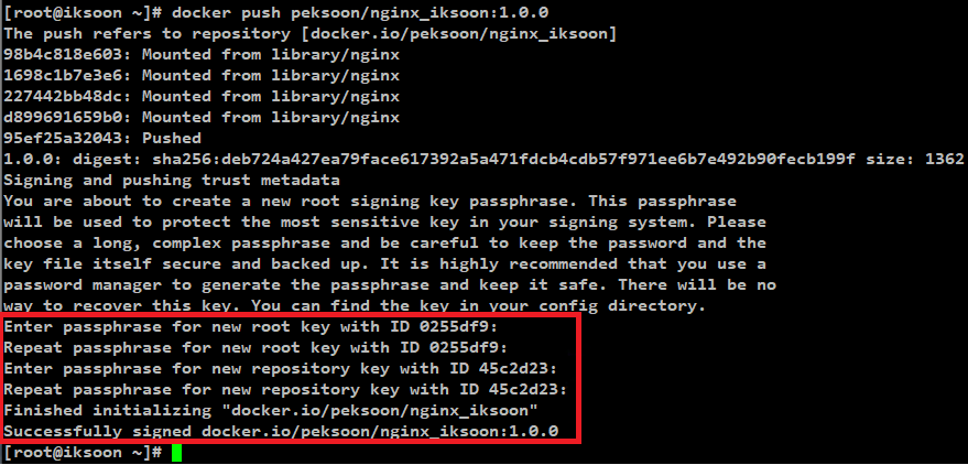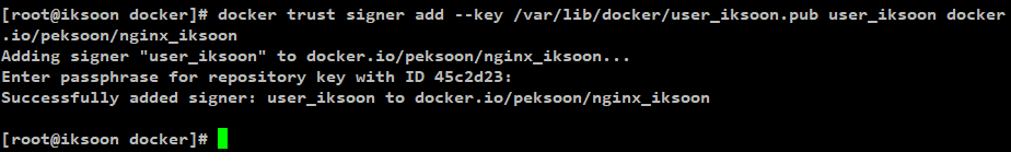예)docker trust signer add --key user_iksoon.pub user_iksoon docker.io/peksoon/nginx_iksoon