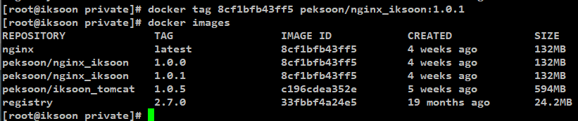 docker tag [대상 image id] [Docker Hub ID]/nginx_iksoon:1.0.0