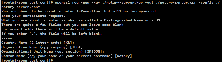 명령어: openssl req -new -key ./notary_rootca.key -out ./notary_rootca.csr -config ./notary_rootca.conf