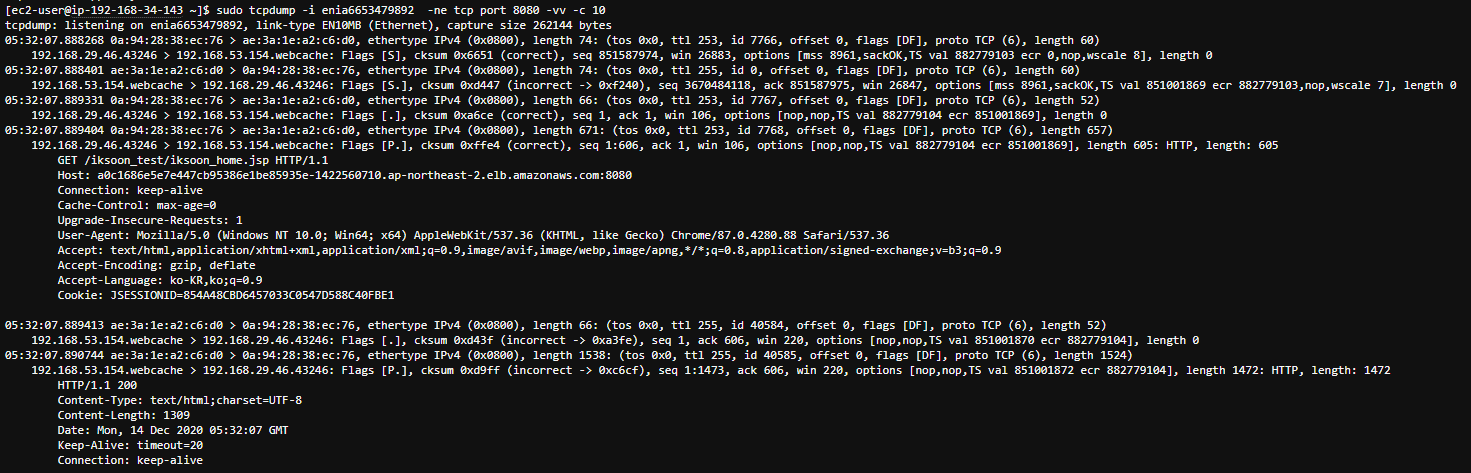 sudo tcpdump -i enia6653479892 -ne tcp port 8080 -vv -c 10