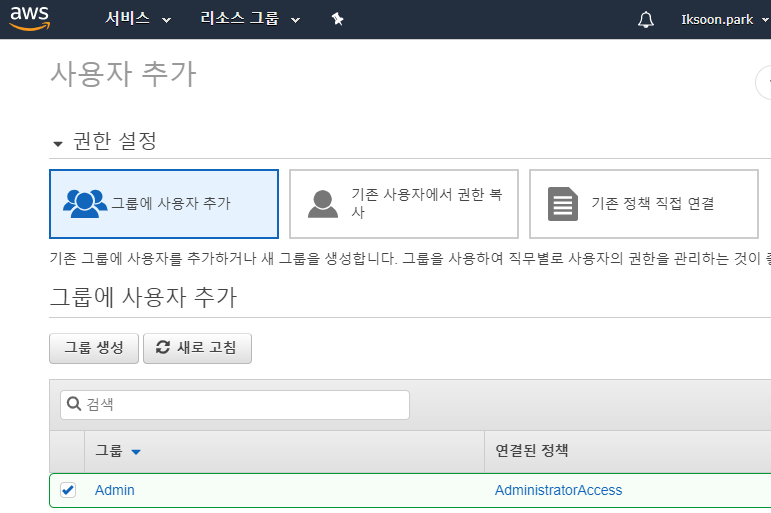 기존에 그룹이 있는 경우는 아래 예제의 admin과 같이 본인이 생성했던 그룹이 있을 것