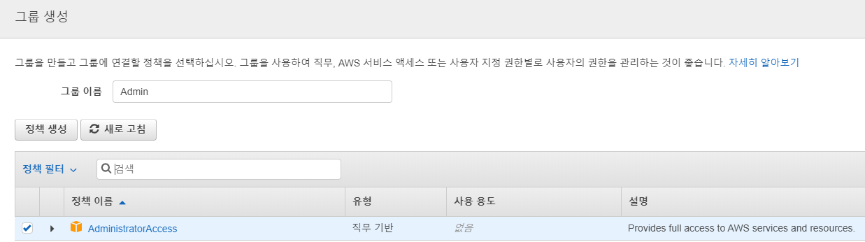 예제는 administratorAccess 권한을 가진 그룹을 생성함