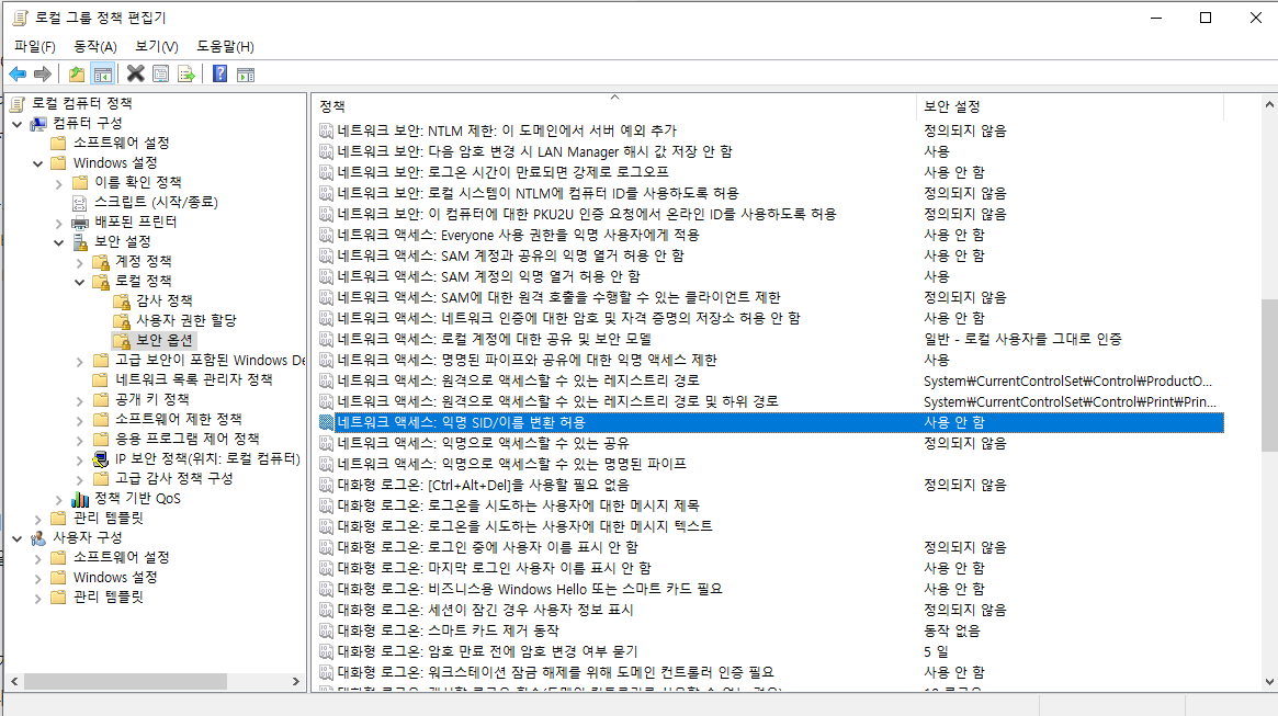보안설정 > 로컬 정책 > 보안 옵션 > 네트워크 액세스 : 익명 SID/이름 변환 허용