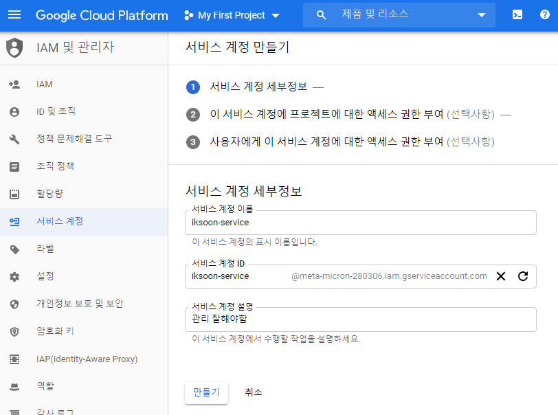 2.2.2. 서비스 계정 이름, 계정 ID 를 넣어주고 만들기 클릭