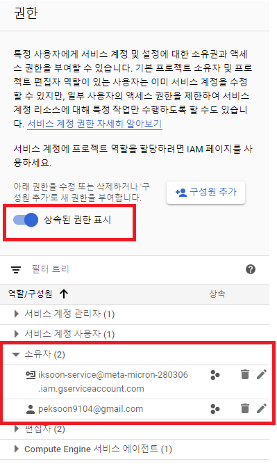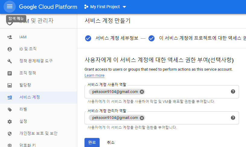 서비스 계정 사용자 역할 : 이 계정 사용가능한 유저