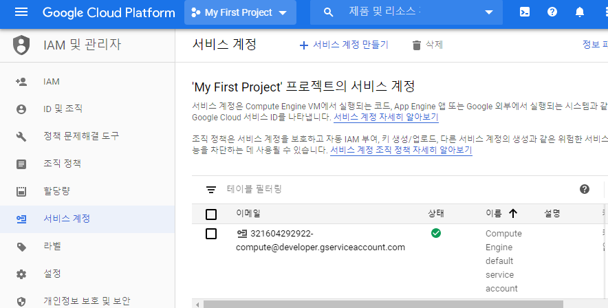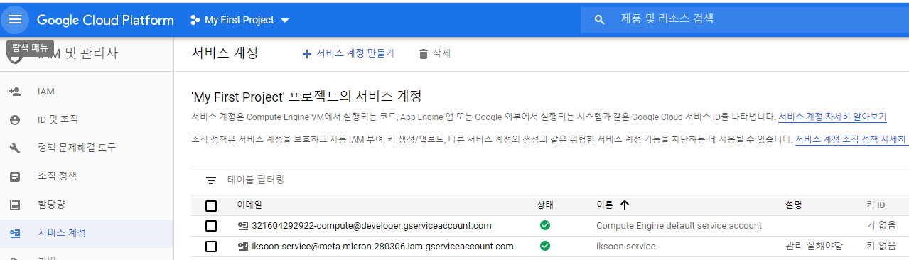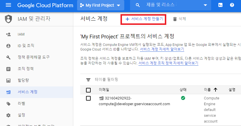 2.2.1. 상단의 +서비스 계정 만들기 클릭