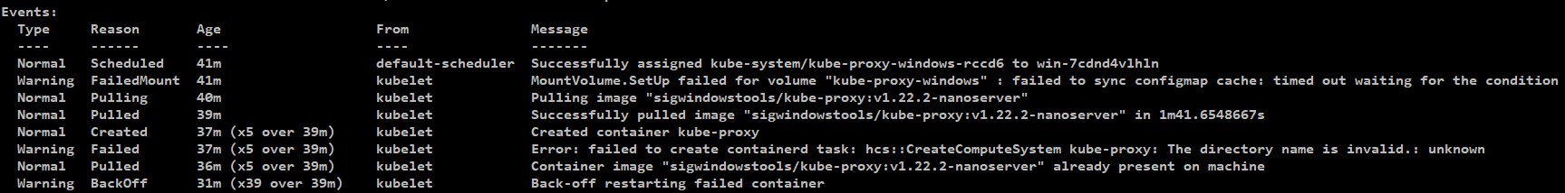 kubectl describe 명령으로 windows node에 배포된 flannel, kube-proxy pod를 확인해보면 아래와 같은 오류 메세지를 확인가능.