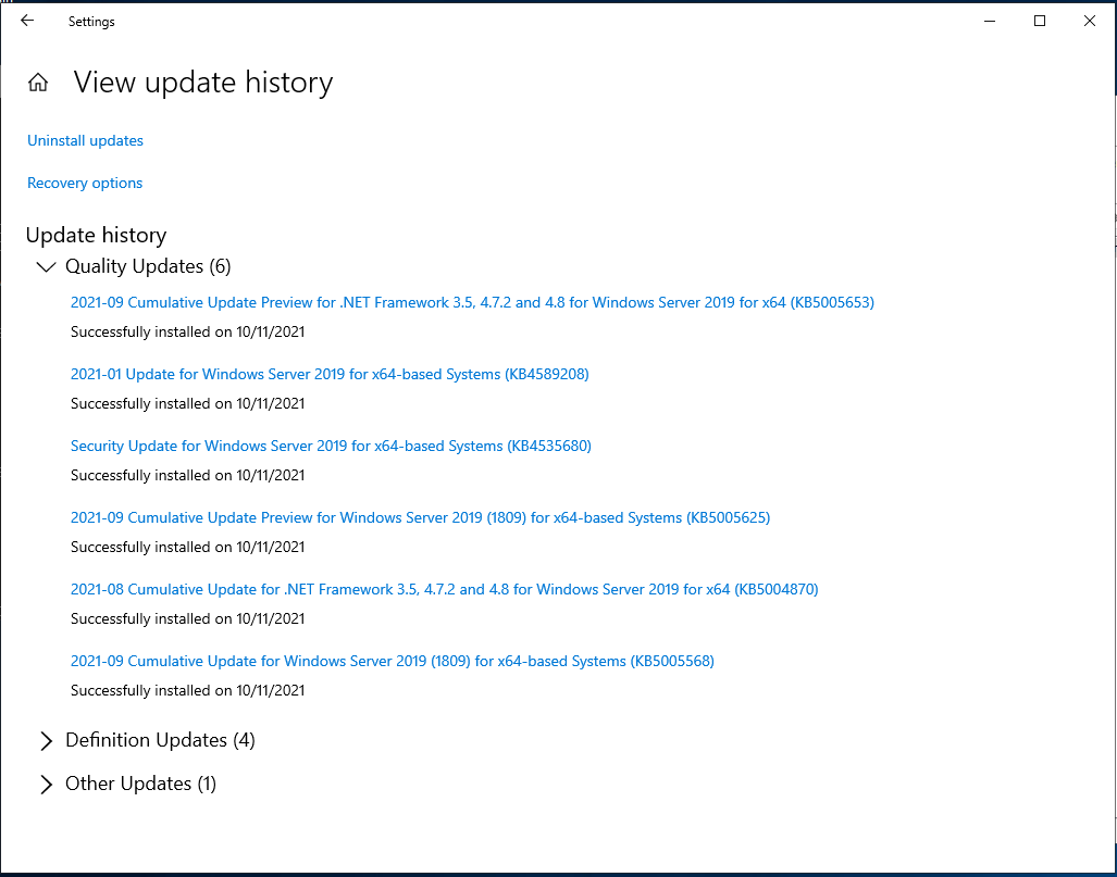 KB4489899 관련 패키지가 설치되어있지 않아서 발생하는 오류임.