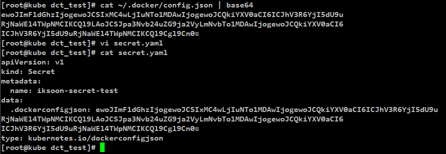 kubectl create secret generic iksoon-secret-test --from-file=.dockerconfigjson=/root/.docker/config.json --type=kubernetes.io/dockerconfigjson