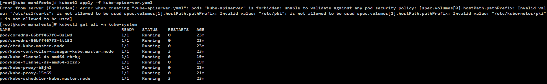 Error from server (Forbidden): error when creating "kube-apiserver.yaml": pods "kube-apiserver" is forbidden: unable to validate against any pod security policy: [spec.volumes[0].hostPath.pathPrefix: Invalid value: "/etc/ssl/certs": is not allowed to be used spec.volumes[1].hostPath.pathPrefix: Invalid value: "/etc/pki": is not allowed to be used spec.volumes[2].hostPath.pathPrefix: Invalid value: "/etc/kubernetes/pki": is not allowed to be used]