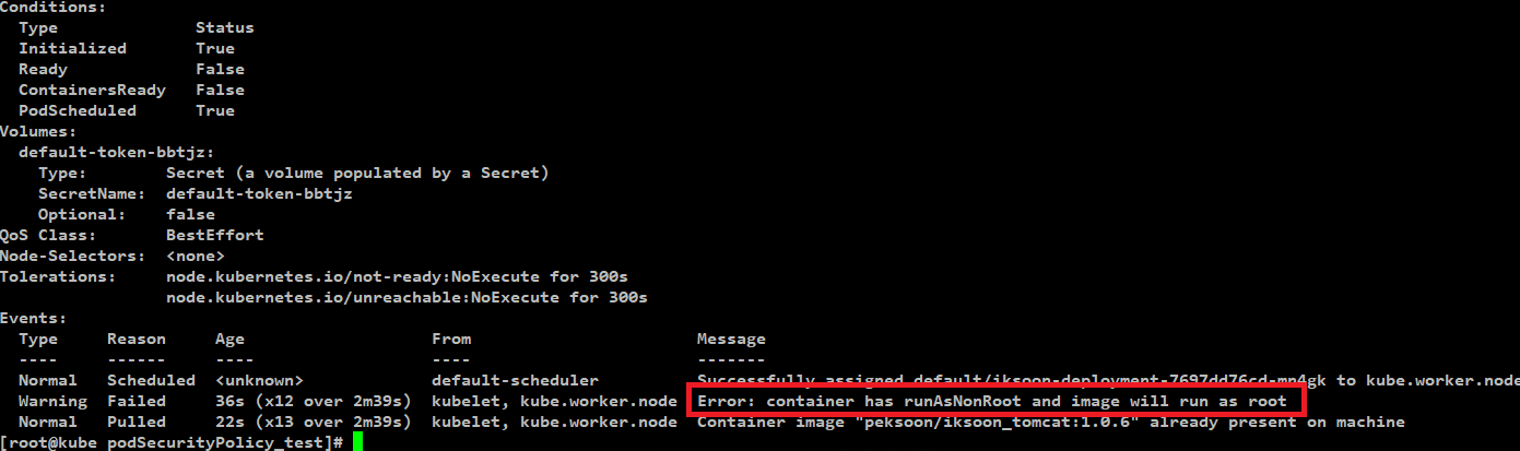 Pod Security Policy 에서 Privileged 권한을 false로 줬는데
