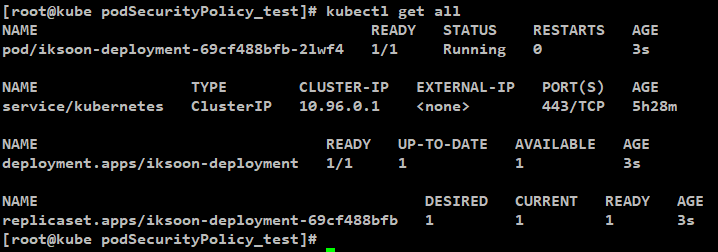 Pod Security Policy 정책에 따라 pod도 정상적으로 생성됨.