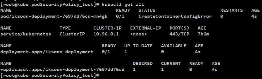 상위에서 생성한 PSP 정책 에 위반되서 Container 생성이 안됨.