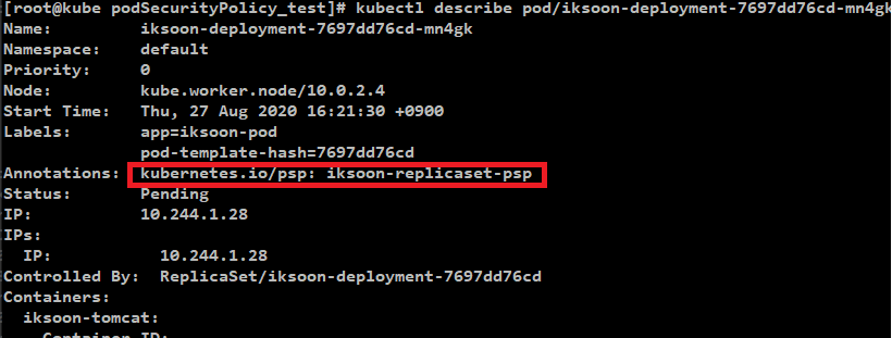 Annotations 항목에 적용된 PSP 를 확인할 수 있음