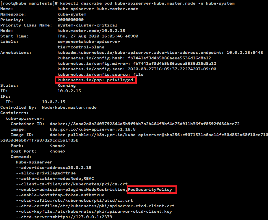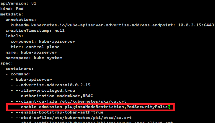- --enable-admission-plugins=NodeRestriction,PodSecurityPolicy