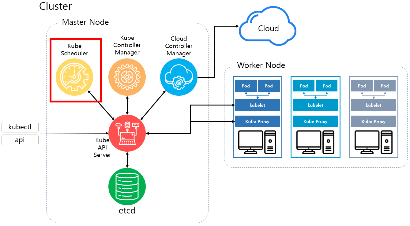 Cluster의 Kube-Scheduler 모듈이 담당하는 기능으로