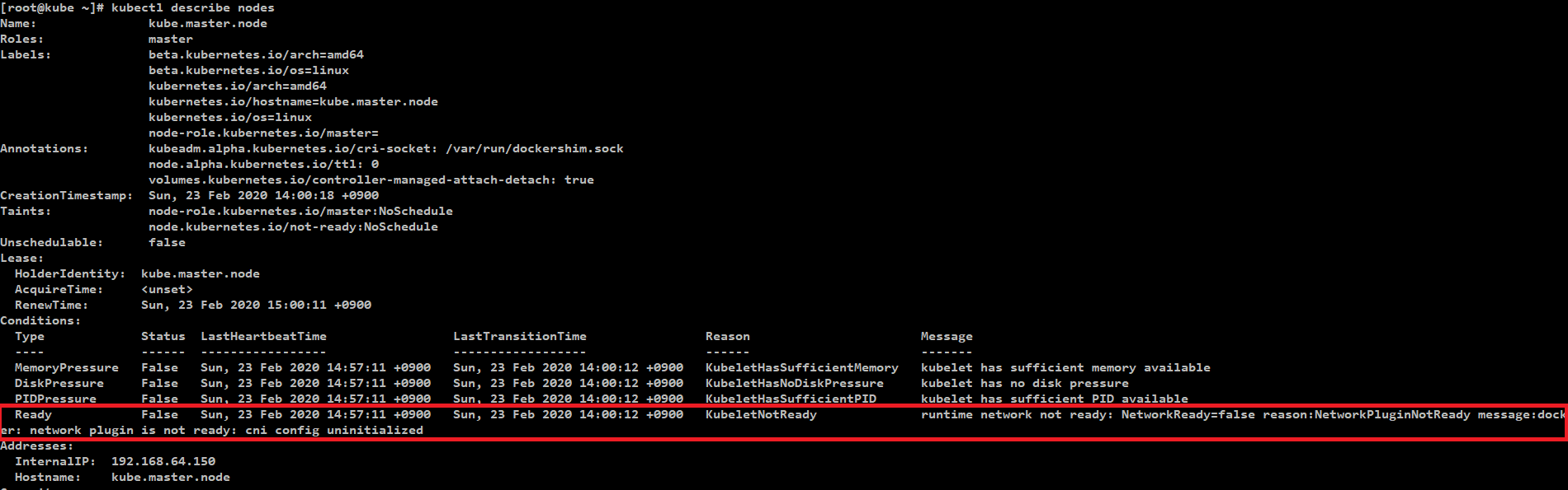 원인 파악을 위해 kubectl describe nodes 명령으로 노드의 자세한 정보를 파악함