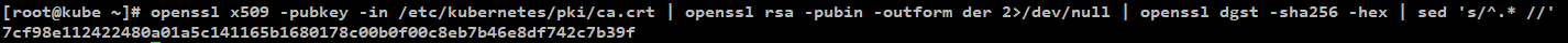 명령어 : openssl x509 -pubkey -in /etc/kubernetes/pki/ca.crt | openssl rsa -pubin -outform der 2>/dev/null | openssl dgst -sha256 -hex | sed 's/^.* //'